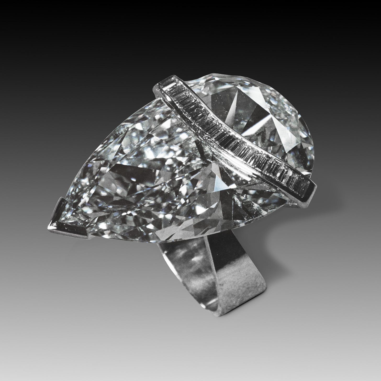 "He set a line of baguette diamonds across the table, as if to mask a flaw. But the diamond was flawless." It was a tongue-in-cheek move, a rebellion against the idea that diamonds were superior to other stones.